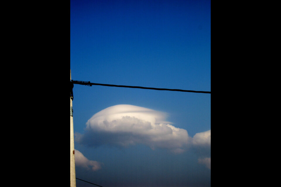 Ich hatte eine seltsame Erfahrung mit einer Wolke, es war vor ein paar Monaten. 16:35 Uhr verließ ich den Supermarkt und überquerte die Straße, und in diesem Moment sah ich eine große Wolke am Himmel in Form einer Scheibe. Es begann sich auszudehnen und plötzlich [gab es] einen Blitz und ich dachte, es sei Donner, aber es gab keinen Ton. Es war klar um uns herum, blauer Himmel und helle Sonne. Ich hatte den Eindruck, dass ich die einzige Person war, die sich das ansah. Als ich mit dem Überqueren der Straße fertig war, machte ich ein Foto. Ich hatte mehr Bilder, aber sie waren in einem anderen Handy, das nicht mehr reagierte. Ich füge das Foto bei, das ich speichern konnte.